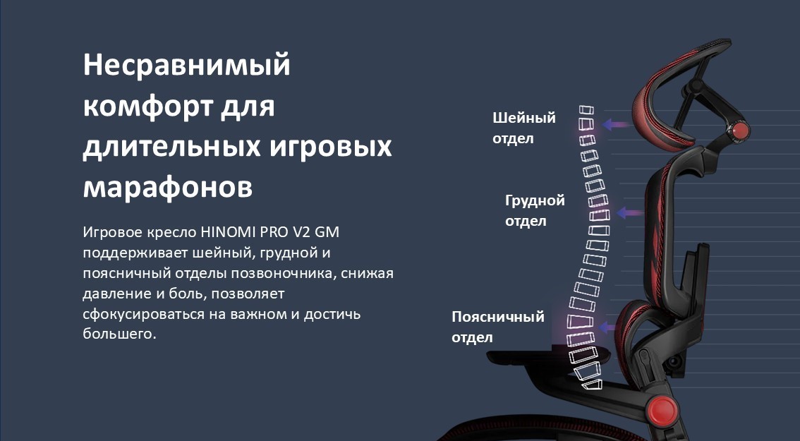 Эргономичное игровое кресло HINOMI PRO V2 GM – это сочетание агрессивной внешности и безупречного комфорта.