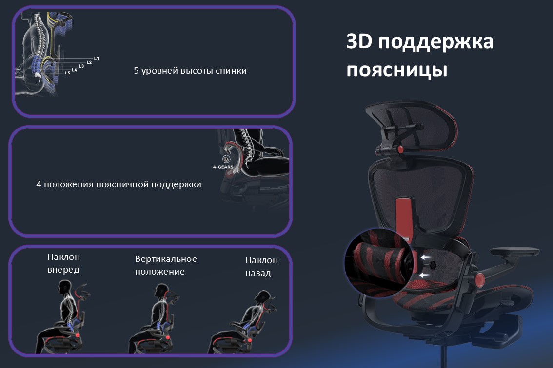3D поясничная поддержка регулируется по высоте и глубине в зависимости от конфигурации поясничного изгиба.