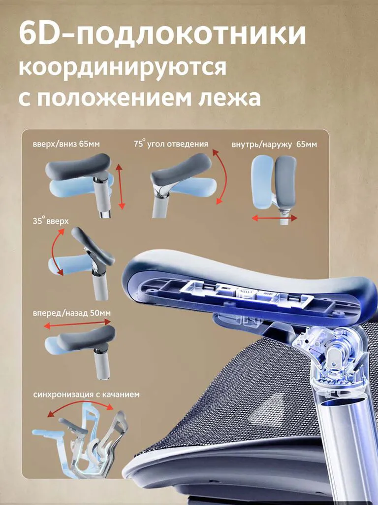 - 6D-подлокотники с шарнирами: подъем, выдвижение, вращение, наклон, перемещение внутрь/наружу.