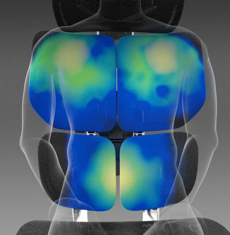 Длительные исследования показали что спинка  QuadSync  снижает нагрузку на позвоночник на величину от 20 до 30% , снижает напряжение в зонах контакты спины с креслом на 30-35% за счет увеличенной площади контакта спины с спинкой кресла.