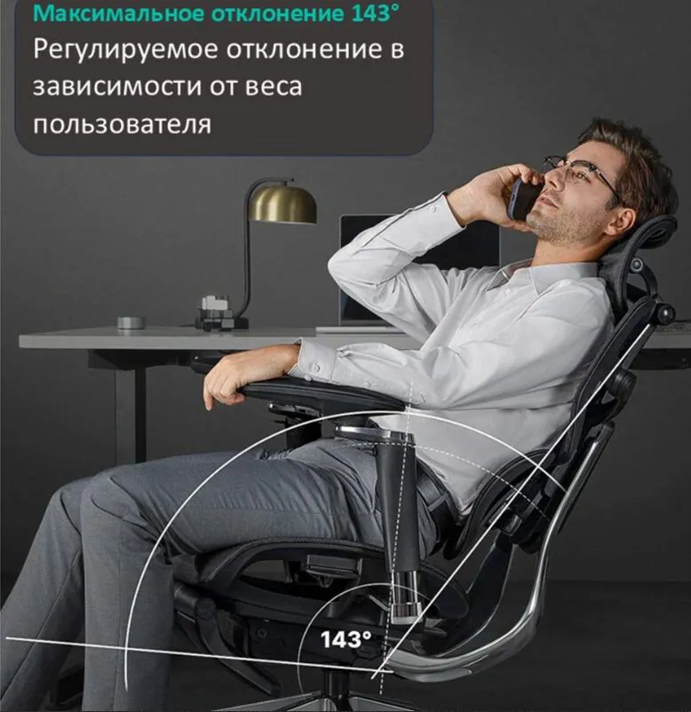 Синхромеханизм наклона допускает максимальное отклонение спинки назад на 143 градуса.