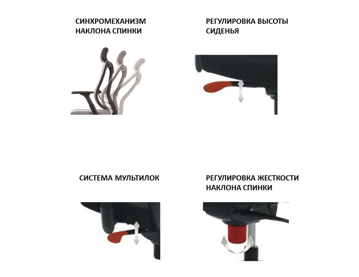 • Синхромеханизм наклона спинки; регулировка жесткости наклона спинки; регулировка максимального угла наклона спинки