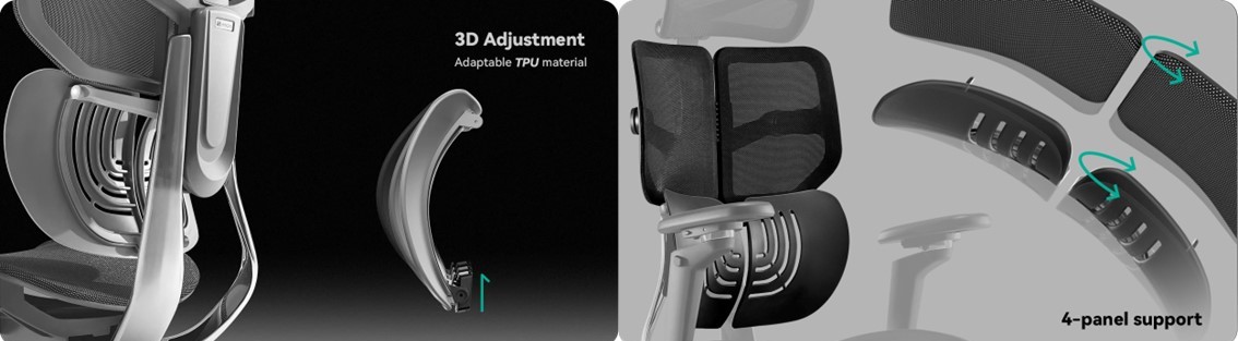 Первое, что бросается в глаза это необычная спинка кресла, состоящая из четырех панелей. В отличии от традиционных кресел, которые имеют сплошную монолитную спинку, эргономичное компьютерное кресло HINOMI X1 предлагает инновационный подход для обеспечения максимального комфорта спине. В эргономичном компьютерном кресле HINOMI X1 внедрена 4-х панельная сегментированная спинка, где каждая панель спинки предназначена для поддержки определенной части спины. Верхняя часть спинки снижает значительную часть нагрузки с плечевой зоны и верхней части туловища, а нижняя часть обхватывает и мягко придерживает поясничный отдел, тем самым обеспечивая комфортное состояние на многие часы напряженной работы.