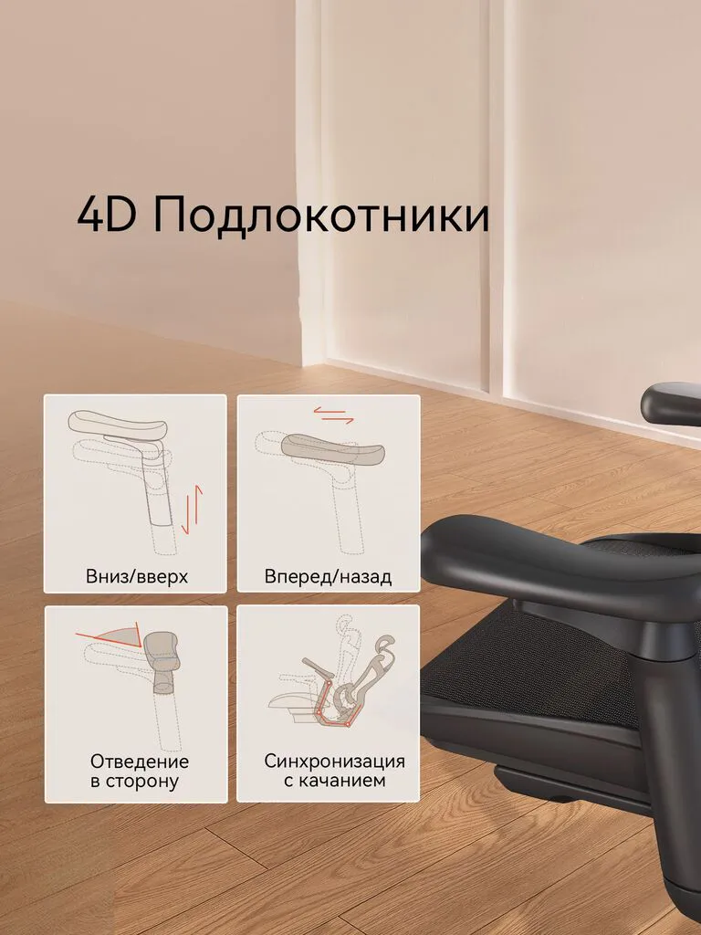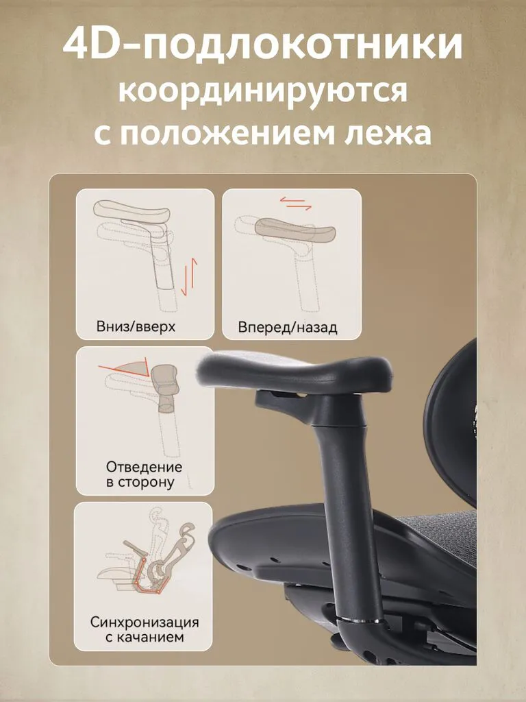 - 4D-подлокотники с шарнирами: подъем, вперед/назад, внутрь/наружу, синхронизация с режимом качания.