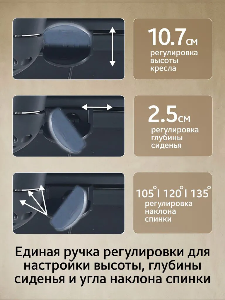 - Удобная настройка одним нажатием (высота, наклон, перемещение сиденья). Регулировка глубины сиденья: 2,5 см. и высоты сиденья: 10,7 см. Что позволяет точно настроить посадку для максимального комфорта.