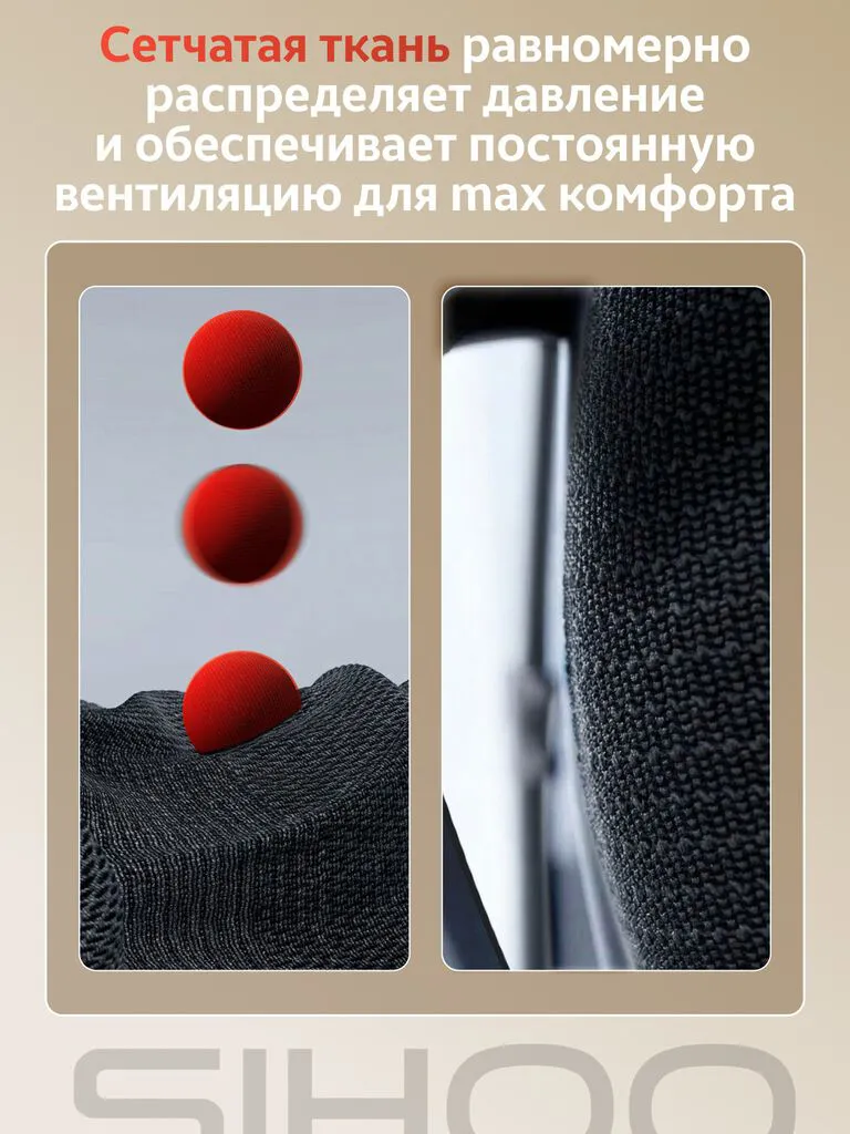 • Материалы- Cloud Stretch Mesh — фирменная эластичная сетка Sihoo: прочная, упругая, воздушная и устойчивая к износу и пятнам.