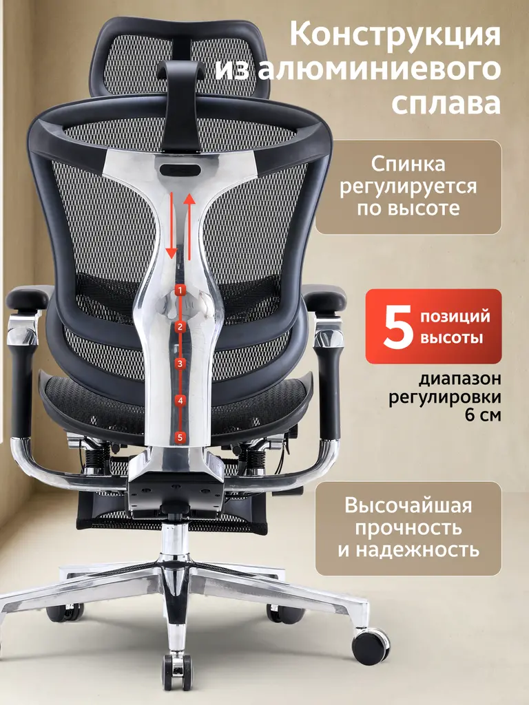 - Выдвижная подставка для ног. - Материалы- Cloud Stretch Mesh — фирменная эластичная сетка Sihoo: прочная, упругая, воздушная и устойчивая к износу и пятнам. Плотность 490Г/㎡.