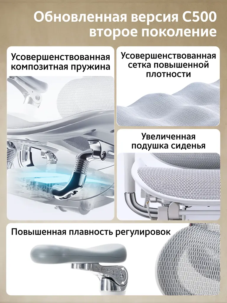 • Материалы- Cloud Stretch Mesh — фирменная эластичная сетка Sihoo: прочная, упругая, воздушная и устойчивая к износу и пятнам. Плотность 490Г/㎡.
