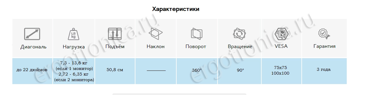 Рекомендованная нагрузка: 18 кг (вес мониторов + вес клавиатуры + вес кабелей в боксе для их хранения). Максимальный вес монитора (нагрузка на шарнир): 6,4 кг.
