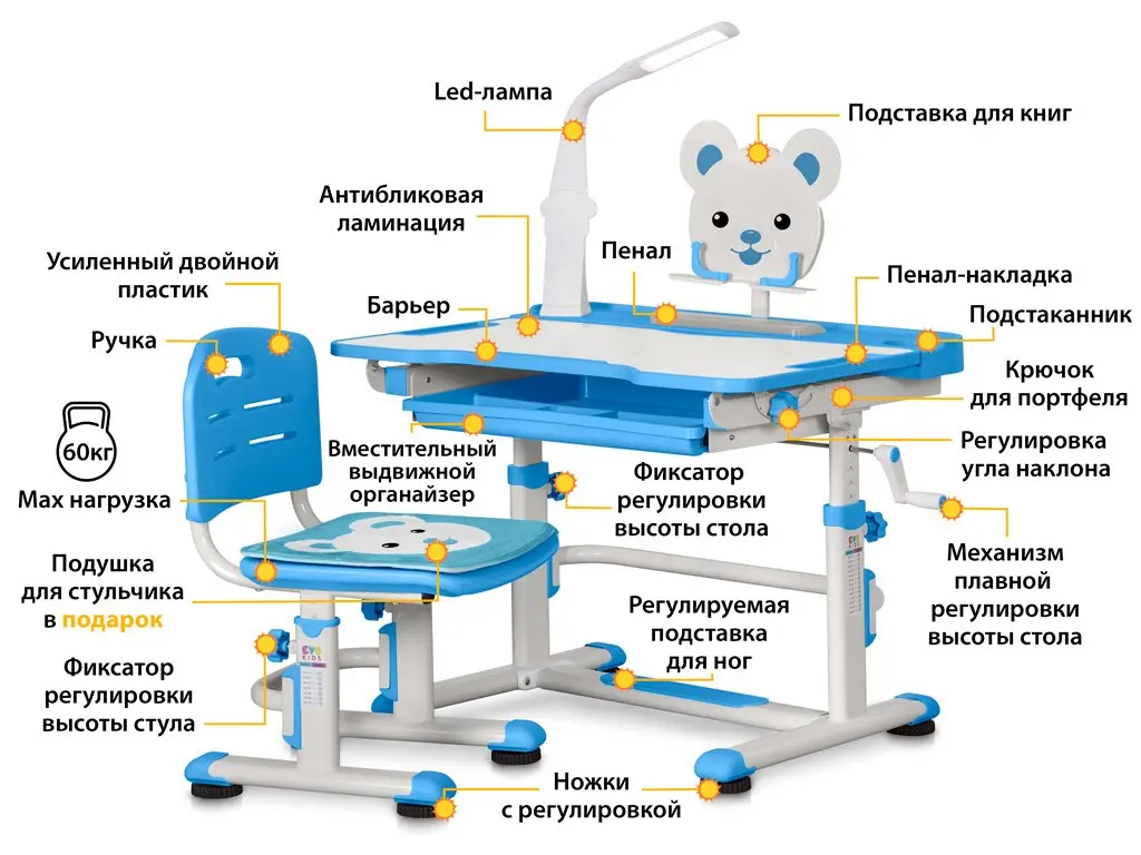 Комплект парта и стульчик ЭргоКидс БД-04 Нью Икс Эль Тедди (с лампой) самое главное: