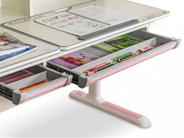 Подвижная часть столешницы легко изменяет угол наклона с помощью специального газлифта от 0 до 50 градусов. Благодаря такому большому диапазону регулировки стол можно использовать не только для чтения и письма, но и для рисования (как мольберт). Безопасный зазор гарантирует, что ребенок не прищемит пальцы, когда захочет самостоятельно изменить угол наклона.