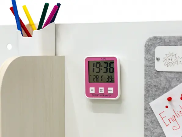 Часы-гигрометр с функцией измерения температуры и влажности в детской комнате. Кроме того, возможно установить будильник. Часы закреплены на металлическую стенку полки. Передняя панель доступна в голубом и розовом цвете, и прекрасно гармонирует со сменным декором парты.