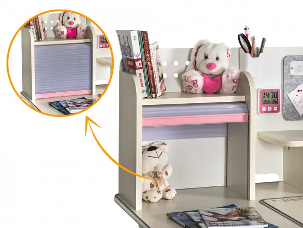 Ниша с ролетом. Для большей вместительности у полки-надстройки есть две полочки поменьше для размещения книг и одна ниша для хранения вещей, которая закрывается подвижным пластиковым ролетом.