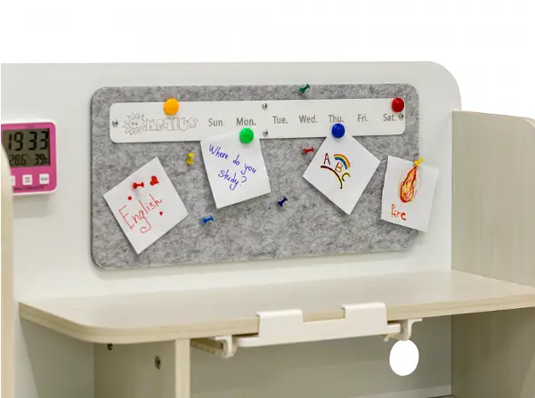 Многофункциональная полка- надстройка. Отличительная особенность полки-надстройки стола в ее функциональной стенке. На металлической поверхности можно крепить заметки на магниты, на тканевой части – фиксировать записи с помощью шпилек или булавок.
