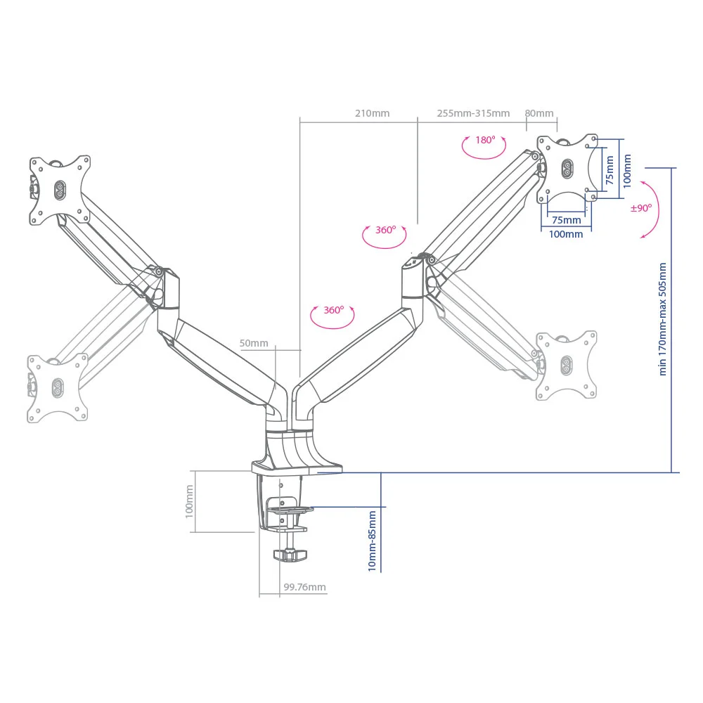 Регулировка угла наклона ±90°, поворот осуществляется на 270°