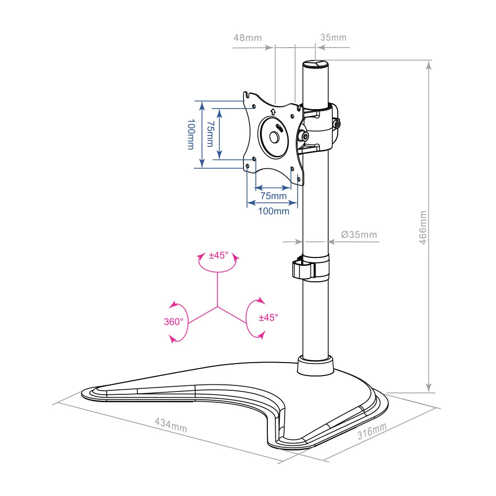 Регулировка угла наклона ±45°, поворот на ±15°, вращение на 360°